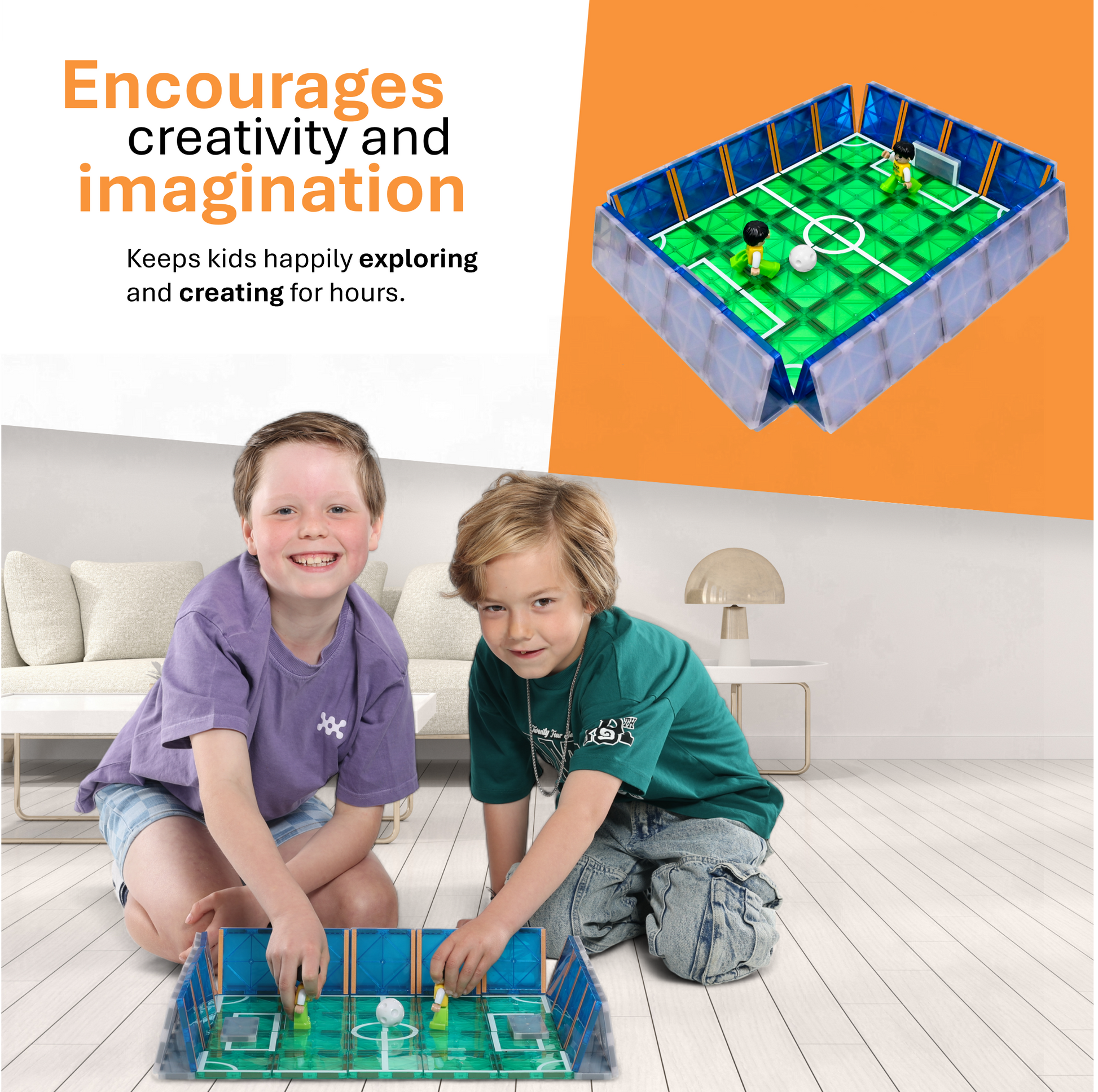 Breng de spanning van het voetbalveld naar jouw MagnaMinds-collectie met deze unieke magnetische bouwset! Met de speciaal ontworpen tegels creëer je eenvoudig een compleet voetbalveld waarop de meegeleverde minifiguren kunnen spelen.